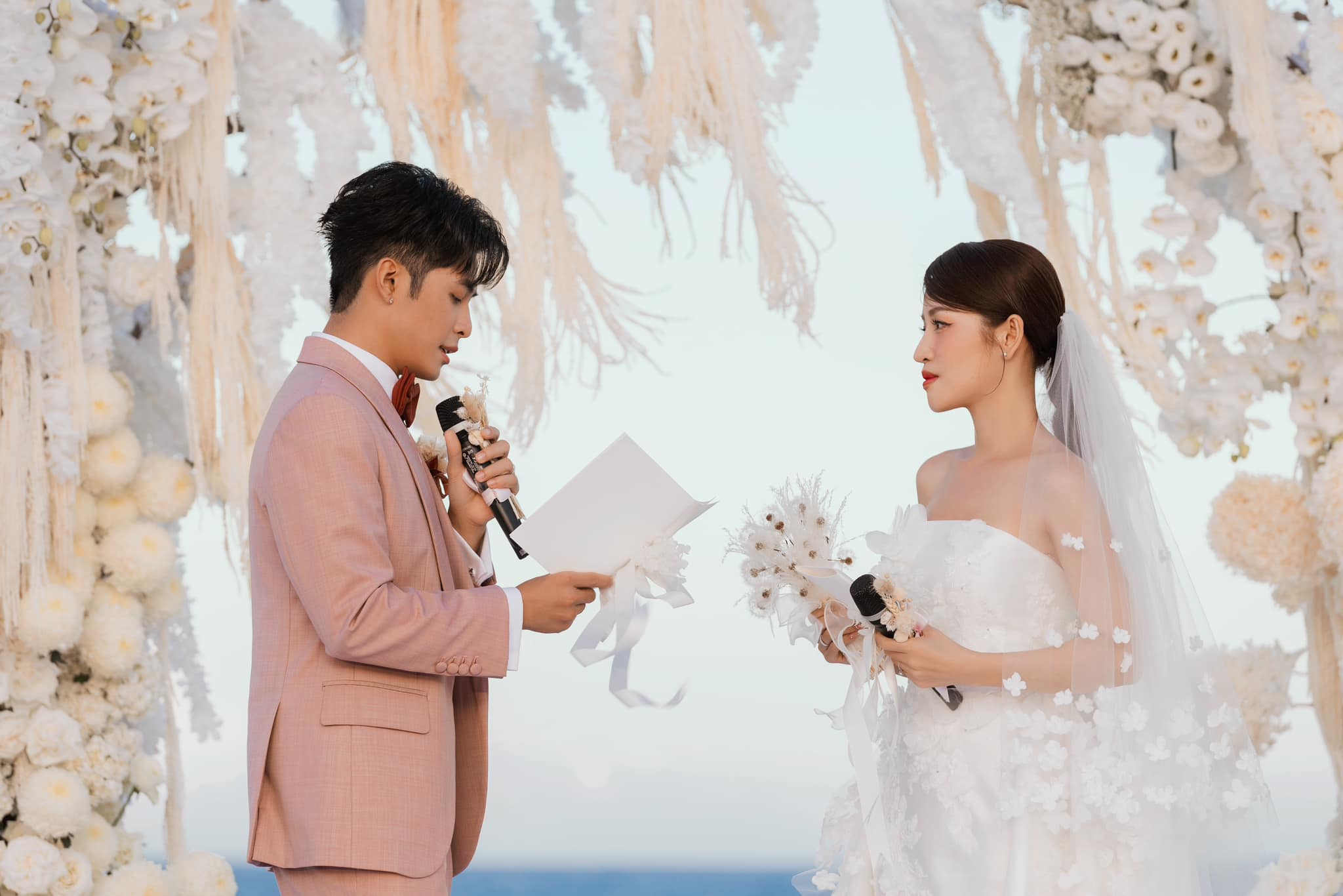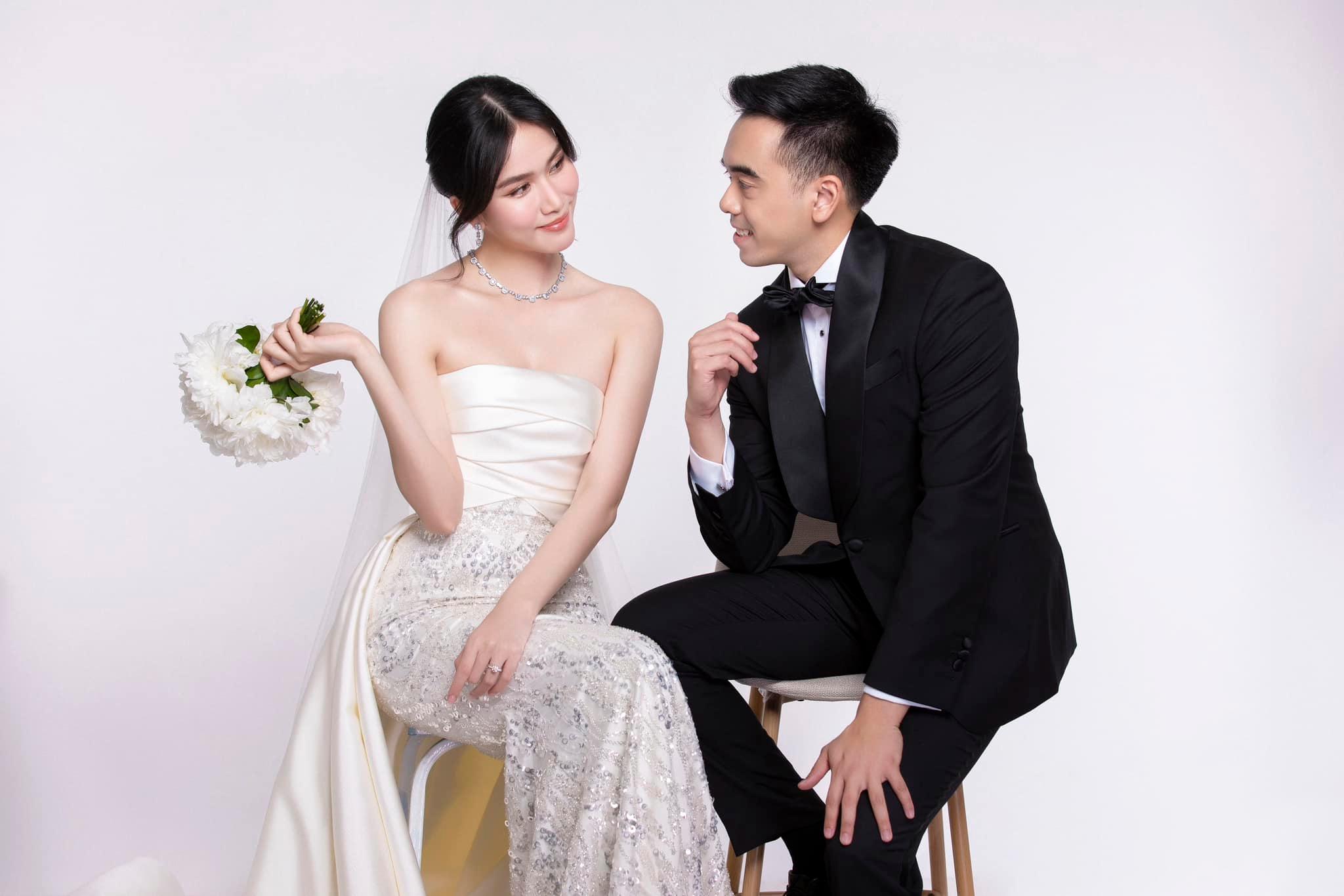 Quoc Anh, an actor, displays easy charm and grace in his beautiful white tuxedo by Kim Bespoke. Standing behind Tieu Vy, he completes an elegant...