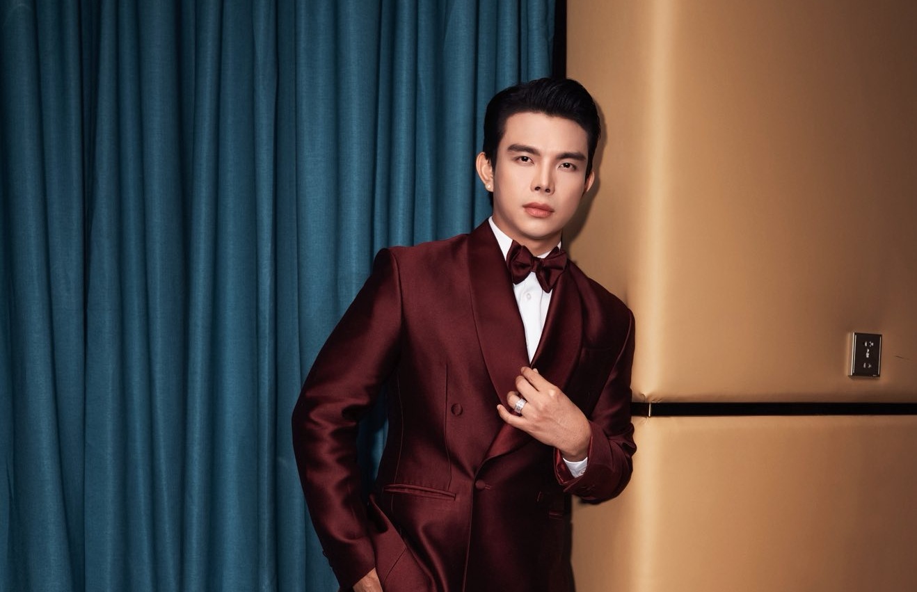 Designer Đỗ Long appears in a Kim Bespoke Burgundy Tuxedo at the Đẹp Awards 2025.