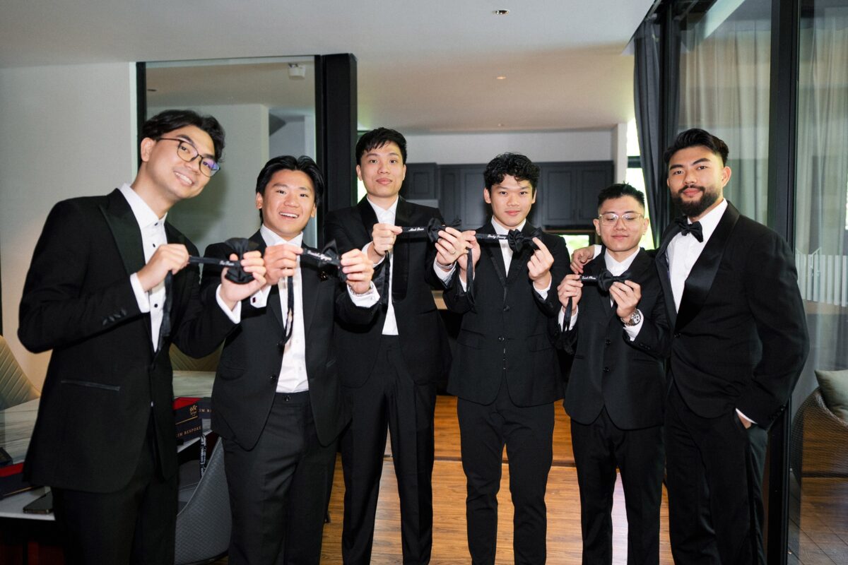 Dressed in a bespoke black tuxedo, groom Nick Q Trần made a lasting impression with his elegant and confident appearance. What made the celebration even more memorable was the special gift he prepared for his groomsmen—his closest friends: embroidered bow ties, each personalized by Kim Bespoke.
