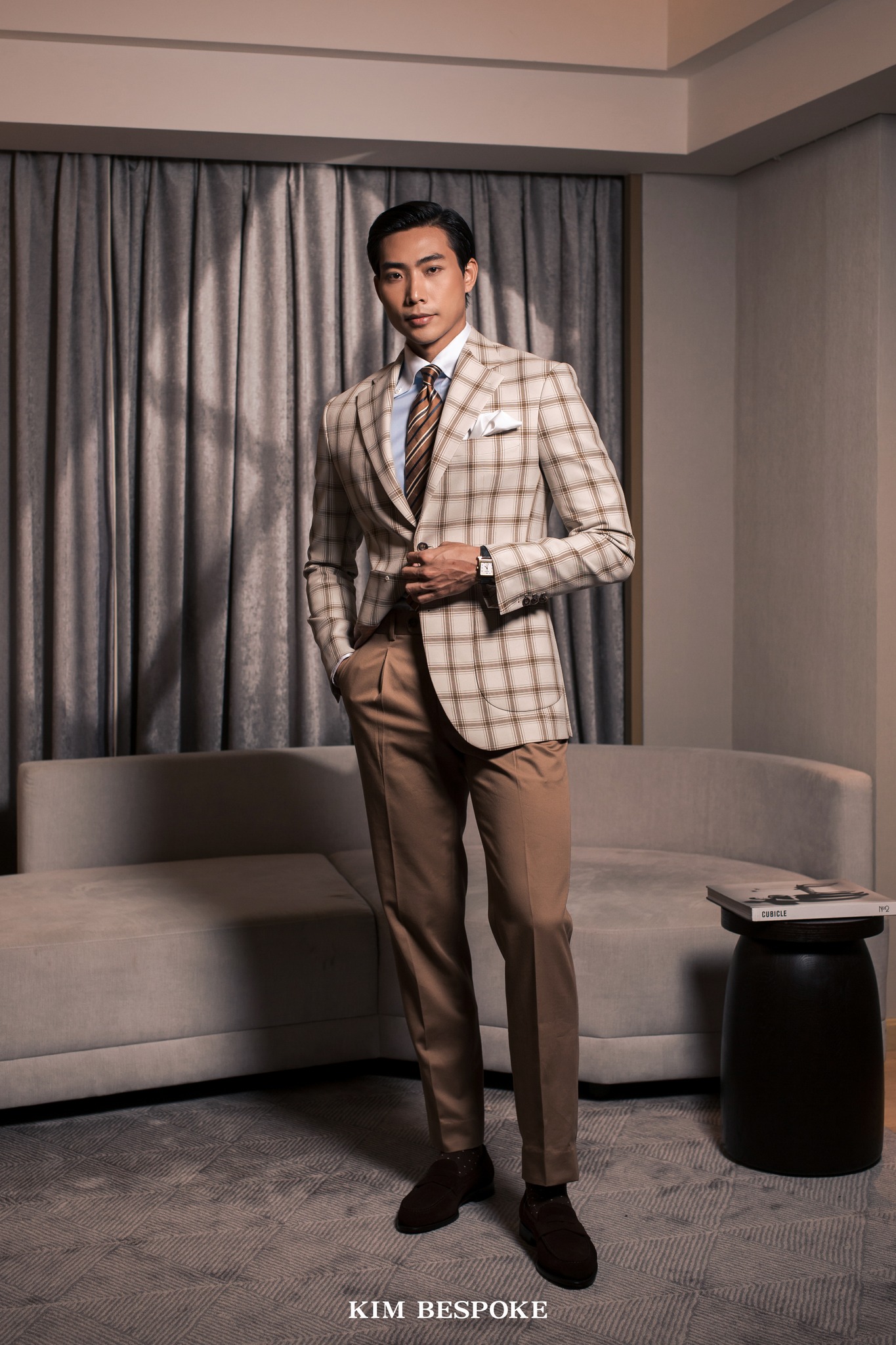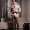 In perfect harmony with the khaki tone of the trousers, the Champagne Cheers jacket features a beige base with subtle brown check patterns, evoking warmth, joy, and an inviting sense of sophistication. This color combination naturally draws attention — in all the right ways.