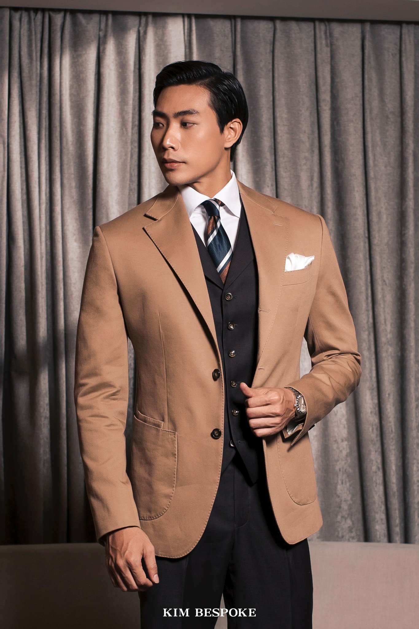 The mature depth of Chocolate meets the fresh vitality of Resort Tan, creating a brown-toned harmony that showcases a unique yet timeless sense of style. By swapping the traditional three-piece Chocolate look for a Resort Tan jacket in the same tone, this outfit opens up greater versatility in mix & match possibilities. The cotton texture of the jacket adds a casual touch, making it ideal for semi-formal or relaxed social settings.