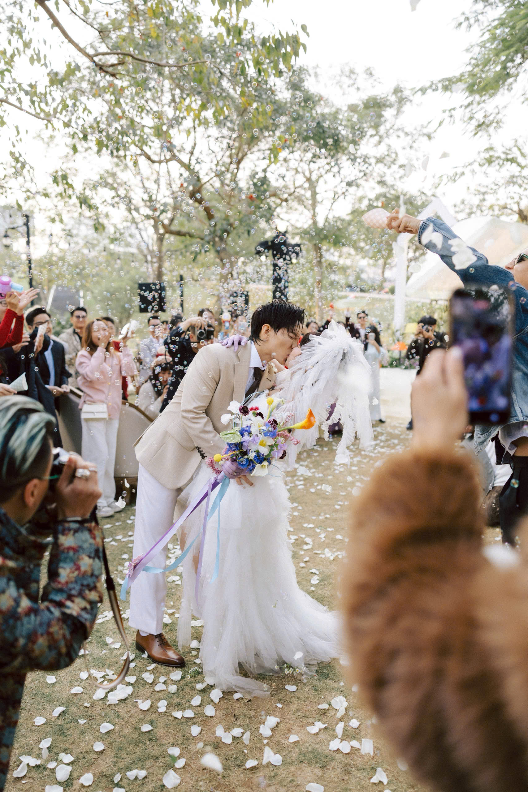 Amidst a garden adorned with blooms and sunshine, groom An appeared in a three-piece biscuit brown suit tailor-made by Kim Bespoke for his special day....