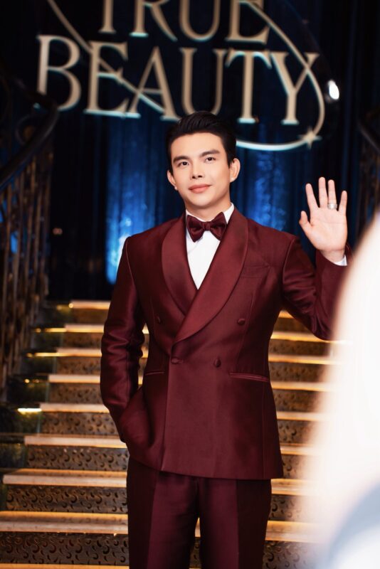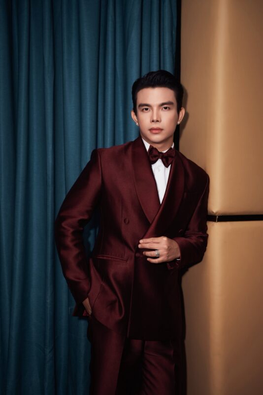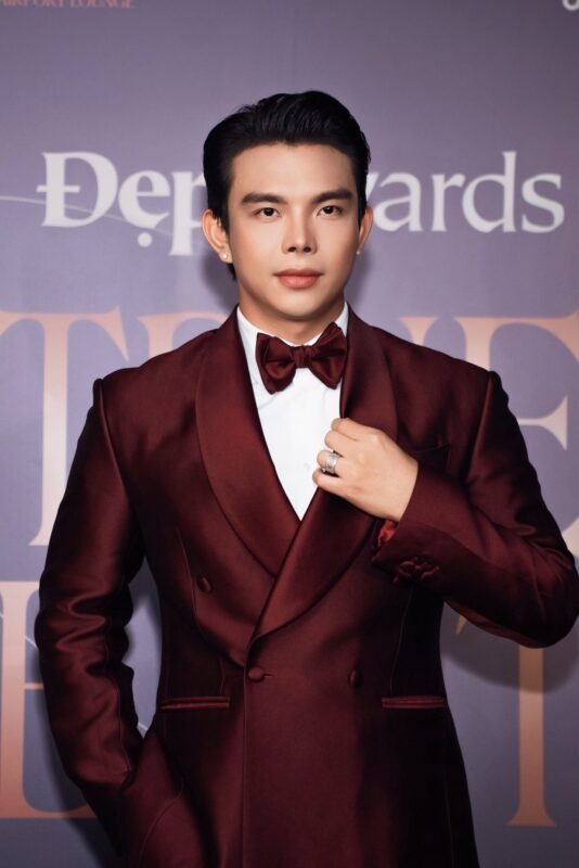 Designer Đỗ Long appears in a Kim Bespoke Burgundy Tuxedo at the Đẹp Awards 2025.
